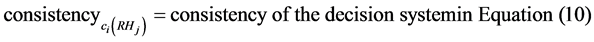・ The consistency of the decision system, one system is inconsistent when at least exist two objects indiscernible that belongs to different classes simultaneously; see the equation (10). Values near 1 represents high consistence.