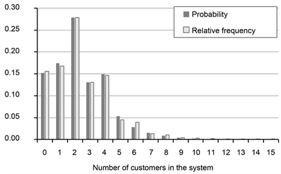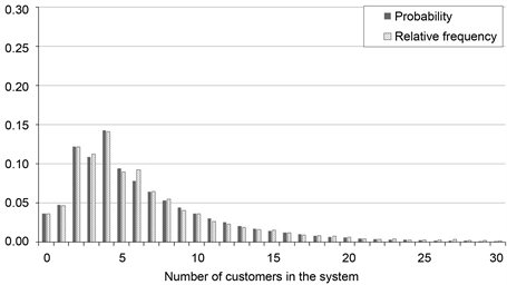 In Figure 2, again, there is not difference between the probabilities computed with Equation (24) and the relative frequencies obtained when simulating the system (except may be for 6 customers in the system), the probability reaches its maximum for 4 customers (0.1428 in Table 1) but then, contrary to the situation in Figure 1, the probabilities softly decrease and remain larger than 8 × 10−4 for up to 30 customers. The expectation increases accordingly up to near 6.5 customers in the system, on average, 4 of them waiting.