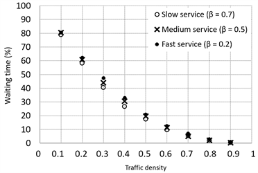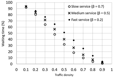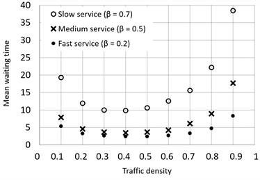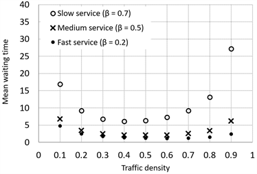 Similar conclusions can be drawn with systems with a = 5 and b = 3 (then a > b, as opposed to the preceding case). Figure 6 shows the effect of traffic density on the mean waiting time computed with the simulations conducted, as before, modifying the rate service from high (β = 0.2), medium (β = 0.5), to low (β = 0.7) and varying the arrival rate α with the purpose of obtaining traffic density ρ from 0.1 to 0.9.