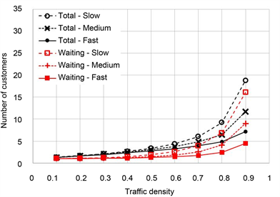 Figure 8. Average number of total customers in the system (black lines) and average number of waiting customers (red lines) vs. traffic density for a = 5, b = 3. Different service rate: slow for β = 0.7, medium β = 0.5, and fast for β = 0.2.