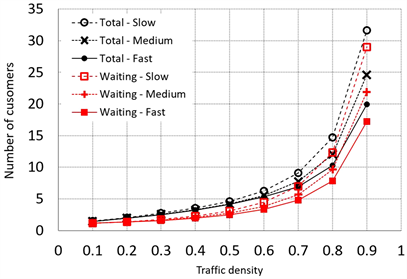 Figure 5. Average number of both total customers (dark lines) and customers waiting for service (red lines) vs. traffic density for a = 2, b = 3, and different rate services (β = 0.7 for slow, β = 0.5 for medium and β = 0.2 for fast services).