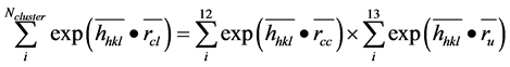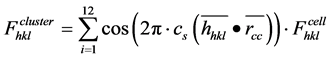 As in crystals, considerable simplification results from the fact that the icosahedral hierarchic structure is centro-symmetric. Scattering of an incident beam may therefore be calculated with real numbers contained in the cosine term, since the imaginary parts cancel. The structure factor Fhkl for a beam with indices h, k, l is then written [18] :