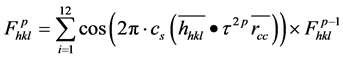 In adapting the formula to quasicrystals, three changes are made. Firstly, the basis cell used in measurement is taken to be the unit cube since the length to edge-width ratio of the icosahedron forms a golden rectangle [20] with dimensions τ × 1. The unit edge width is the diameter of the Al atoms. Secondly the summation is made over a conveniently selected truncation of the infinite ideal quasicrystal. Thirdly, because there is no reason to suppose that the diffraction follows Bragg’s law, an extra variable cs, the compromise spacing effect, is added as a factor beside fn. By scanning cs, and summing systematically at appropriate intervals, a clear maximum is found in the structure factor. The simulated value is cs = 0.947 (Figure 1), with the condition that the diffraction is understood as linear Bragg order n = 2 [6] [10] [12] , where orders 1, 3, 4, 5 etc. are suppressed in the geometric diffraction. This value for n is, like cs, a simulated maximum.