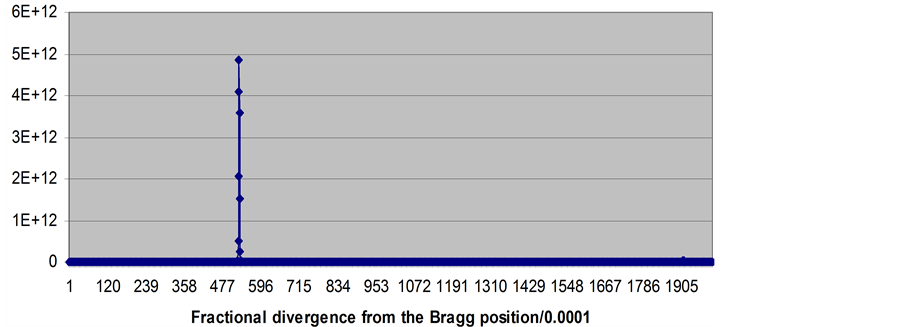 cs was fractionated and scanned. At the origin of Figure 2, the scan starts with the value cs = 1 which represents crystalline Bragg diffraction. All structure factors are zero; there is no Bragg diffraction. From a supercluster order p = 6, the simulated peak width is some ten thousandths of the quasi Bragg angle. This demonstrates the coherence given to scattering from hierarchic structures into the geometric reciprocal space. It is equivalent to Bragg diffraction from a perfect crystal.
