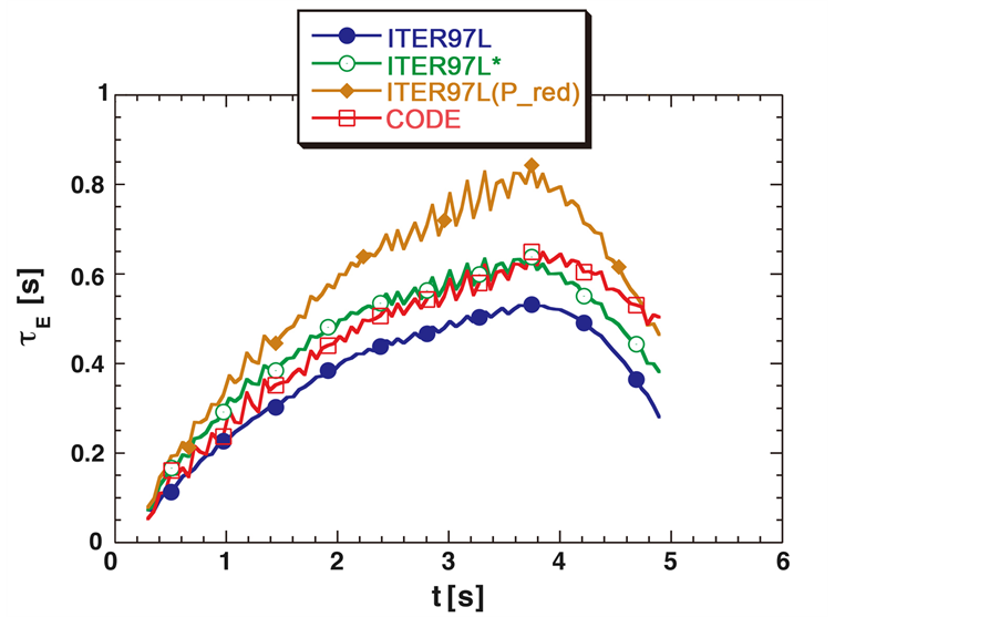 Figure 2. Energy confinement time evolution estimated in [20] by solving with JETTO the balance equations (completed with a transport model): ITER97L scaling (full dots-blue line),