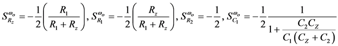 Considering the typical values of various parasitic e.g. Cz = 0.81 pF, Rz = 53 kΩ, β+ = β− = 1 along with C1 = C2 = 100 pF, R1 = R2 = 8 kΩ, the various sensitivities are found to be