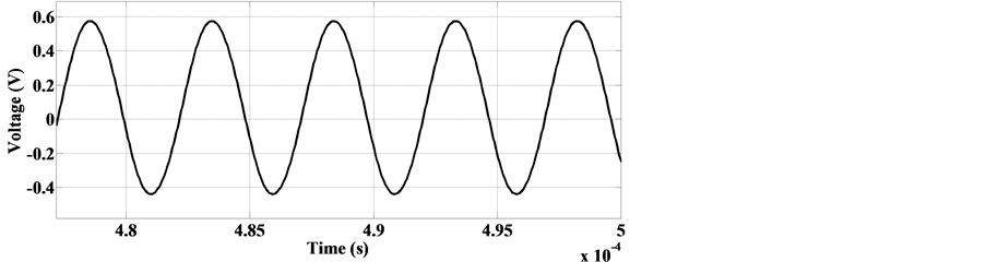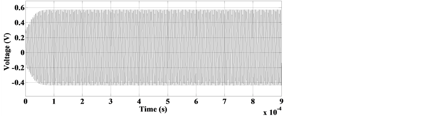 The proposed SRC sinusoidal oscillator is simulated using CMOS VD-DIBA (as shown in Figure 3) to verify its theoretical analysis. The passive elements were selected as C1 = C2 = 100 pF, R1 = R2 = 8 kΩ. The transconductance of VD-DIBA was controlled by bias voltage VB1. The transient response of the proposed SRCO showing the buildup of oscillations for above component values is shown in Figure 4(a). A typical steady state