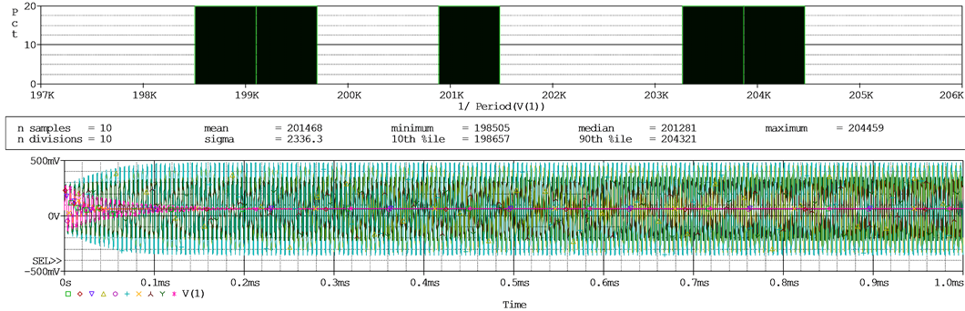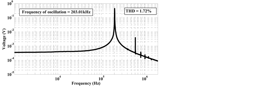 waveform generated by the oscillator for the frequency 203.01 kHz (for the same component values) is shown in Figure 4(b). Figure 5 shows the frequency response of the output, where the Total Harmonic Distortion (THD) is found to be 1.72%. The oscillator circuit of Figure 2 has been checked for robustness using Monte-Carlo simulation, the sample results have been shown in Figure 6 which confirm that, for ±5% variation in the value of R1, the value of oscillation frequency remains close to its normal value of 204.459 kHz and hence almost unaffected by change in R1. Figure 7 shows the variability