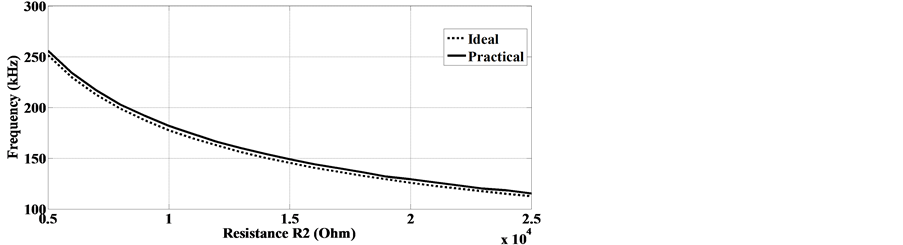 Figure 7. Variation of the oscillation frequency of the proposed SRCO with resistance R2.