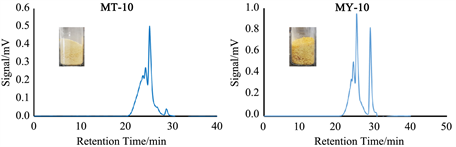 Figure 6. GPC chromatograms and sample images of MT-10 and MY-10 polyimides.