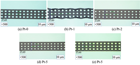 Figure 7. The optical microscopic images of black PDL patterns obtained with (a) Pt-0, (b) Pt-1, (c) Pt-2, (d) Pt-5, (e) Pt-6 photoresists.