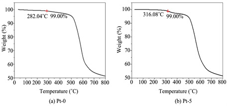 Figure 8. TGA Thermograms of black thin film layer of PDL patterns fabricated with photoresist (a) Pt-0 and (b) Pt-5.