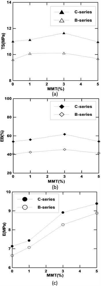 The effects of MMT and a type of ATH on the mechanical properties were investigated. Figure 9(a)-(c) presented the effect of both on the tensile strength (TS), elongation at the break (EB) and tensile modulus (E). It was found that mechanical properties among them for ATH prepared in our study were higher