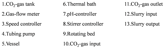 All of the chemicals used were of an analytical grade (Alfa Aesar). The experimental apparatus of the RPB is shown schematically in Figure 2, which was similar to that reported in the literature [31] [32]. The apparatus consisted of a rotating packed bed, pumps, flow meters, speed controller, water bath and reservoir. The rotating packed bed contained wired packing with several layers. A known volume and concentration of reactant (2 M NaAlO2 solution) was taken and fed into the reactor at a desired rotating speed from the top of the reactor through the action of tubing pumps. The reactant temperature was controlled at 25˚C. In addition, a desired flow rate of CO2 gas was fed into the reactor. The reactant was pumped through the distributer into the rotating packed bed and made contact with CO2 gas, where the primary step of the reaction occurred. Then, the product slurry flowed out of the reacting chamber and was collected in the product reservoir. The time from the beginning of this process to the end is termed the reaction process time when the solution pH reached 12. At the end of operation, the slurry was withdrawn and heated to the desired temperature level for the aging process. After the aging process, the slurry was filtered and rinsed with acetone, and the cake was dried in a hot air oven for one hour. The dried powders were analyzed by XRD to identify the composition of the product. The decomposition temperatures of the dried powders were determined by means of XRD (Rigaku, D/MAX2200) analysis. Then, the ATH powders were characterized further by means of TGA/DSC (TA, SDT-Q600), SEM (JEOL, JSM-6500F) and BET (PMI, BET 201-APCW) analyses.