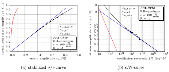To describe the fatigue behaviour of a short fibre reinforced material in the low cycle regime of the S/N-curve, strain controlled tests were performed. For each hysteresis loop the maximum and minimum stress and strain are determined. In addition to the tension-, compression- as well as the dynamic- and the tip-modulus are derived to describe the stiffness reduction. The comparison of the dynamic- and the tip-modulus gives information about the shares of damage on the total damage. Based on the test results, the cyclic stabilized -curve as well as the -curve are derived and implemented in a dataset for the lifetime assessment. With the described procedure, with strain controlled tests, the fatigue life time of reinforced polymers in the low cycle regime of the S/N-curve can be described. To clarify the influence between stress and strain control, further tests must be conducted at equivalent load levels. The behaviour of reinforced polymers strongly depends on the amount of reinforcement, their orientation, surrounding temperature and counting other effects. Therefore the most important effects have to be identified and tests have to be performed to describe them. The use of unified material laws, well known for metals, should be examined.