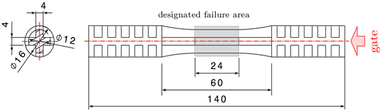 amplitude fatigue design rules, applying a service load factor, are used to account for service strength. To increas the state of knowledge in regard to low cycle fatigue of sgfr materials, tests were performed on this material. Therefore cross-shaped specimens were used for testing. In Figure 6 the detailed geometry is shown. In particular these specimens were used for rotary bending tests [30] as well as for axial tension/compression tests with different notch radii. Different notch-geometries can be provided by tooling inserts. As the material characterisation is done on this specimen type for former publications ( [3] [21] [30] [31] [32]), this type was chosen to get comparable results. Due to their geometry the specimens are resistant against buckling and can be used under pressure loads. For strain controlled tests a parallel sample region with a constant cross-section is used. To ensure a force transmission from the test rig to the specimen, the clamping area is supported by ribbing. A transition radius compared with a higher cross section ensures rupture in the designated failure area. The specimens were produced by injection moulding and used dry as moulded. Due to the moulding-process an averaged fibre orientation, represented by the eigenvalues of the 2-order orientation tensor [3], along the longitudinal axis of can be achieved.