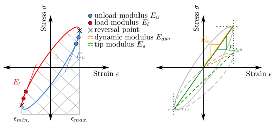the entire test is characterized by the elastic modulus E. Since polymer based materials show a non-linear material behaviour even on low load levels, the cyclic modulus is evaluated between two defined points. Following the evaluation of the secant modulus of quasi-static test, according to [34], a strain of and after the reversal points at and for each hysteresis is chosen. The modulus for the load path as well as the modulus for the unload path are evaluated this way. Additionally the tip modulus and the dynamic modulus acording to Equation (9) and (10) can be evaluated. [35] With these quantities, the influences of longterm effects during cyclic loading can be described. While the tip modulus decreases due to cyclic creep, the dynamic modulus stays at a constant level. A hysteretic heating and an progressing material damage lead to a hysteresis-tilt and have an influence on both muduli with proceeding cycle number. If hysteretic heating can be excluded, the different evolution of the tip modulus and the dynamic modulus allows the distinction between creep and material damage. In Figure 9 all evaluated data are shown for one hysteresis loop.