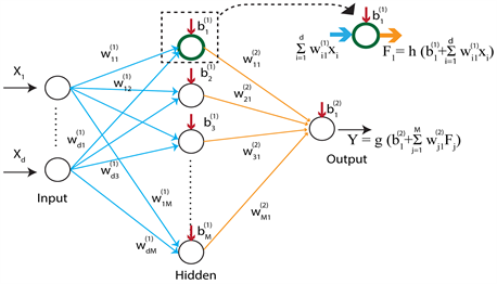 Figure 7, shows the basic architecture of an ANN and it represents a multivariate non-linear function mapping between a set of inputs and outputs variables (Bishop, 1995). These networks are organized as several interconnected layers. Each layer is a collection of artificial neurons (nodes) where the connections are governed by the corresponding weights. Data have been fed through the input layer, and then they pass through the one or more hidden layers, and the final outcome is given by the output layer.