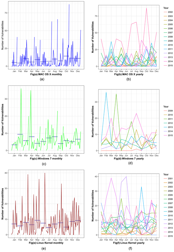 In Figure 8, Figure 8(b) shows no seasonality or cyclic behavior is present over a year. It is clearly visible that there is sharp increase of vulnerabilities in year 2015 in comparison to the other year, 2002 to 2014. However, the Mac OS X system shows a significant random variation of the number of vulnerabilities. Similiarly, in Figure 8(d) each individual year shows random fluctuations of the number of vulnerabilities over a twelve month period. We also concluded that there is no specific pattern of the behavior of the signals on a yearly basis of Windows 7 OS. Year 2009 and 2013 show the largest number of vulnerabilities followed by a significant reduction for year 2015 by a factor of 10. Lastly, Figure 8(f), the signal of each individual year shows random variation of a number of vulnerabilities for a twelve month period. Year 2010, and 2013 show the largest number of vulnerabilities followed by a significant reduction for year 2010.