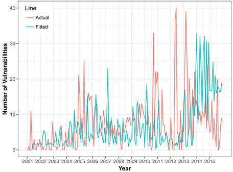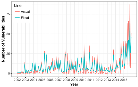 Figure 9 shows the original vulnerability plot against fitted vulnerabilities of MAC OS X Operating System. Even though having random fluctuations that is increasing and decreasing behavior present in each year, our model accurately captures the holistic attributes of the signal with reasonable accuracy.