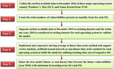For code characteristics based models, we need a source code of the given software to develop statistical models. In reality, source code of the commercial OS is not available to the public. Each and every day new vulnerability comes into existence and we need to handle new vulnerabilities, thus the software should be continuously updated which implies that the source code changes with respect to the life cycle of the software. A company always updates its software so as to fulfill the demands of current or potential customers and hence we need to update the source code regularly. Thus, process of making source code is always dynamic in nature. One of the prominent question that arises here is “how can we forecast the future vulnerabilities by utilizing static source code?”. Knowing very well that no OS is with zero or no vulnerability at all and this will continue in the future. On the other hand, considering statistic density based models, that have been developed are based on a series of underlying assumptions and criteria that may or may not be applicable. For instance, Rescola Linear Model (RL) attempts to fit vulnerability finding rates linearly with time but in reality situations are different for nonlinear behaviours. Because of such limitations that exist on both categories, we should identify an alternative approach to forecast the future vulnerability of an OS by using time series analysis. Our model considers trend, level, and seasonality components if they exist. Similarly, to analyze the non-linear behavior of the number of vulnerabilities, we implemented ANN and SVM methodology.