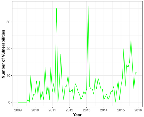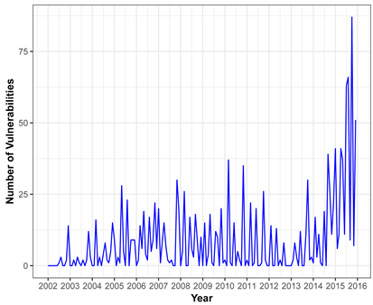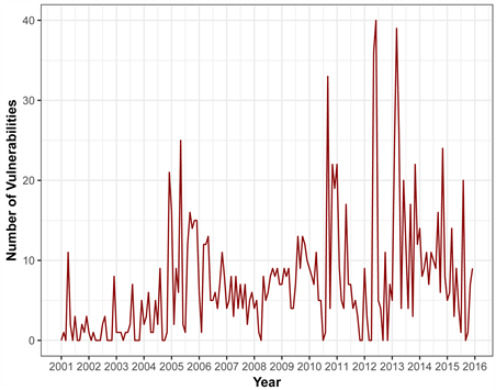 The overall trend of the number of vulnerabilities of Linux Kernel OS is demonstrated by Figure 6 from 2001 to 2015. Even though there is an increasing and decreasing trend, it would be fair to say that there is a significant variation in the number of vulnerabilities especially in 2014 and 2015, with more than