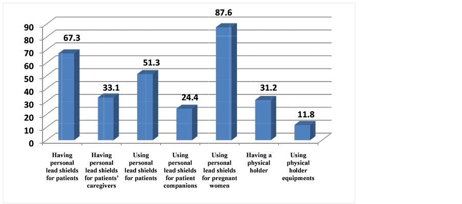 Figure 3 indicates that, out of 108 medical-ray machines, 73 (67.3%) have personal lead shields for patients and 35 (33.1%) have personal lead shields for patients’ caregivers. Out of these windshields, 51.3% of them are used for patients, 24.4% for caregivers, and 87.6% for pregnant women. Furthermore, 34 (31.2%) machines have physical holders for kids and other patients, but only 11.8% of them were used.