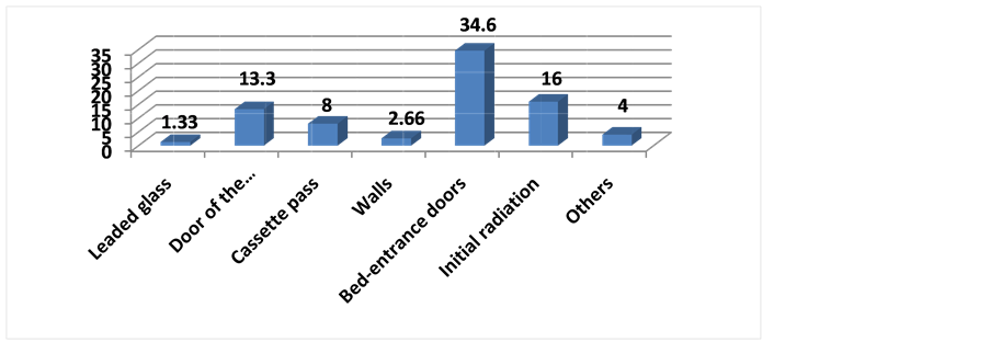 According to Figure 5, 108 ray machines are used in 75 rooms. Among these rooms, leakage was observed in the lead glass of one (1.33%) room, lead doors of 10 (13.3%) control rooms, film transfer windows of 6 (8%) radiology rooms, walls of 2 (2.66%) ray rooms, bed-entrance doors of 26 (34.6%) rooms. Some of the leakages were due to changes in radiation conditions. In 12 cases (16%), doors, film transfer windows, and lead glasses were exposed to the primary radiation. Three other cases of radiation leakage were due to other factors such as improper coverage of lead over walls, improper or fake materials used in lead glasses, and the improper type of lead used.