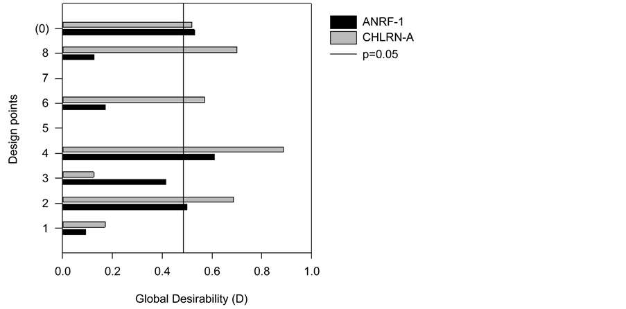 The Derringer function (D) in Figure 1 illustrates the statistical analysis of the results. In this figure, the Y axis corresponds to the design points, the X axis corresponds to the desirability degree ranging from 0 (undesirable) to 1 (most desirable) and the bar