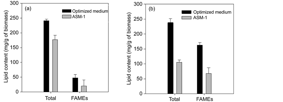 Figure 4. Differences between optimized medium and ASM-1 in the lipid content and FAMEs of Ankistrodesmus sp. (a) and Chlamydomonas sp. (b). Data points are means of three independent experiments and error bars show SD.