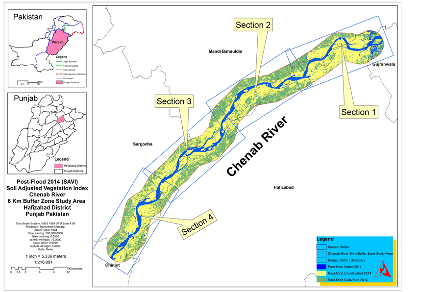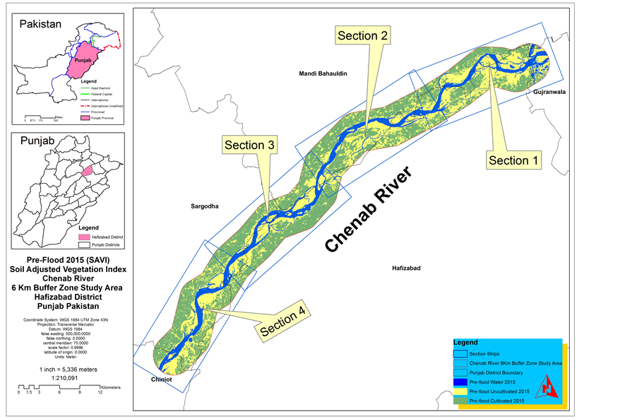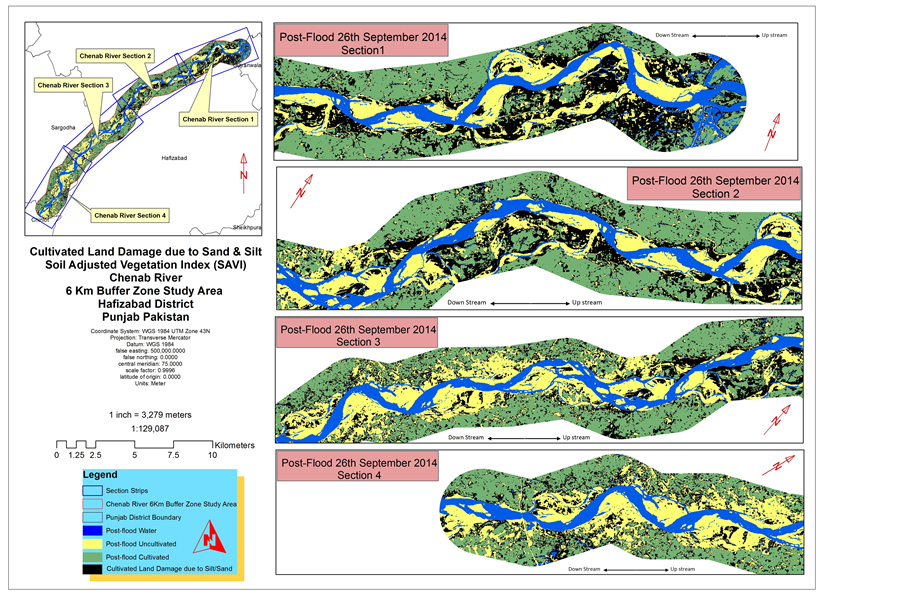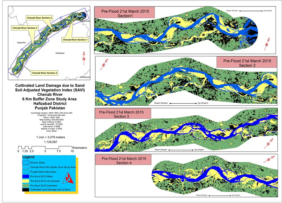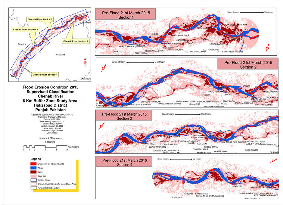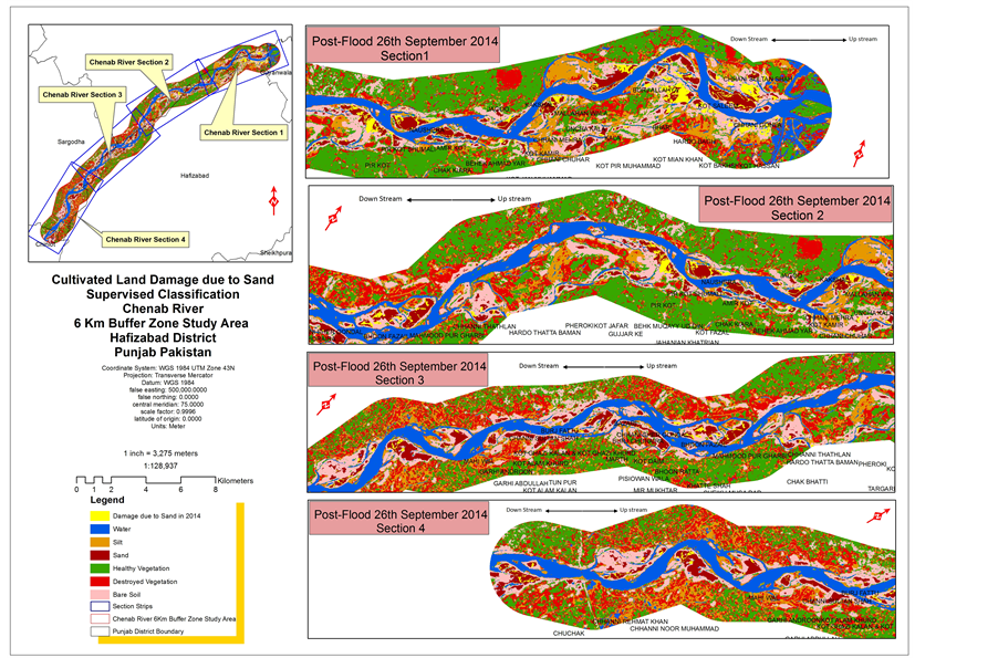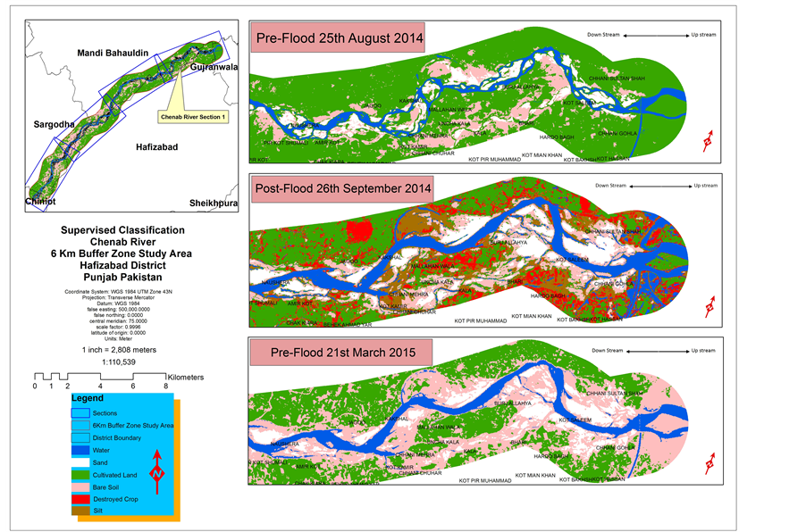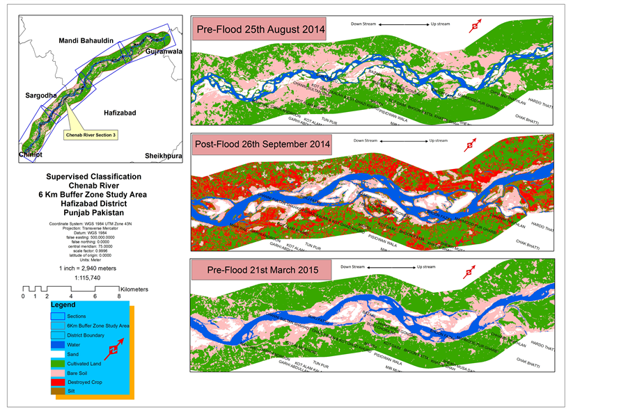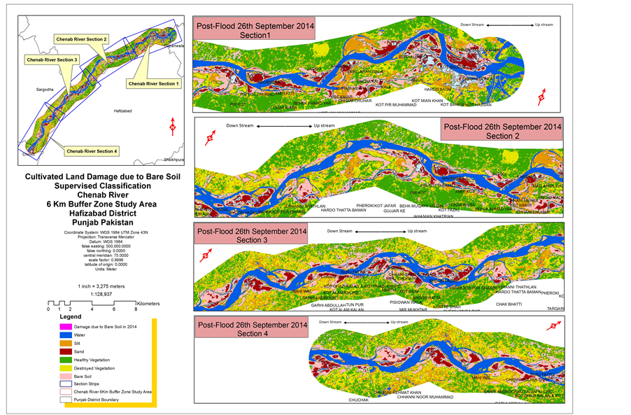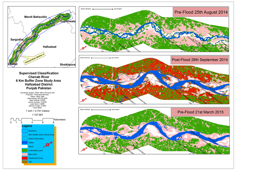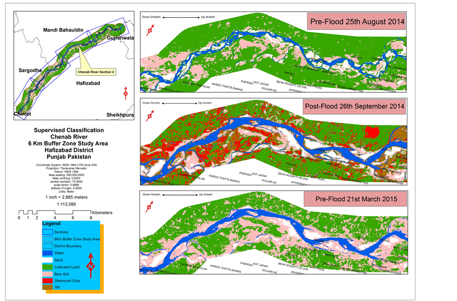 Chenab River, Hafizabad. Image classification process has been completed using Erdas Imagine 2014 software. Spectral information of water, sand, silt, healthy vegetation, and damage vegetation has been used to complete the process of Spectral Pattern Recognition. Pre-flood, post-flood and satellite image of 2015 of Chenab River are classified to delineate water, sand, and silt damages to cultivated lands along the river.
