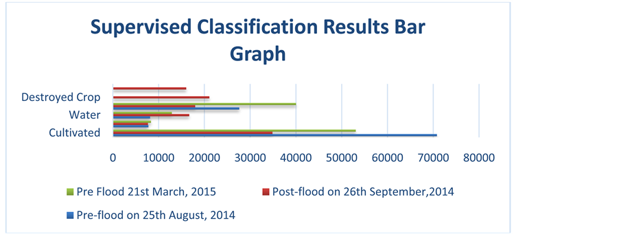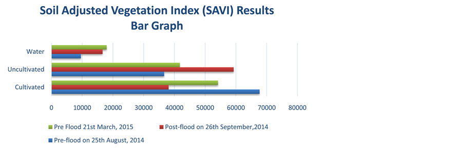 Table 8 describes the qualitative comparison between the results of applied methodologies of this research work for the year of 2014 and 2015. Under this comparison, cultivated, uncultivated, and water situations have been correlated. Cultivated land results of pre-flood 2014, post-flood 2014, and pre-flood 2015 are having close estimations both in Supervised Classification and SAVI. There is an average deviation of 2.18% has been calculated between the results of pre-flood 2014, post-flood 2014 and pre-flood 2015 datasets for cultivated land. 2.3% average deviation for uncultivated land results and 1.9% average deviation for water.