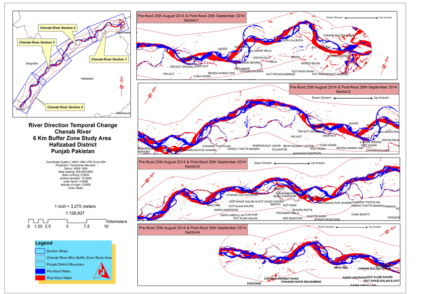 Figure 13. River direction temporal change, pre-flood 2014 & post-flood 2014, Chenab River 6 km buffer zone study area, Hafizabad District, Punjab, Pakistan.