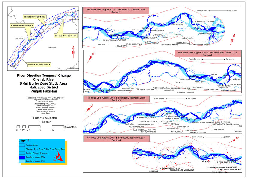 Figure 14. River direction temporal change, pre-flood 2014 & Post-flood 2015, Chenab River 6 km buffer zone study area, Hafizabad District, Punjab, Pakistan.