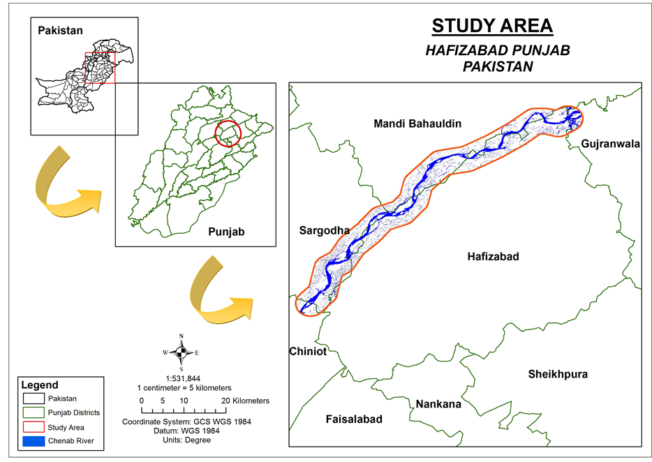 Hafizabad is the district of Punjab Province Pakistan. It is bounded by River Chenab in the eastern side and Sagar Kalan Gadirabad Link Canal in the western side. The river Chenab separates it from district Mandi Bahauddin. Hafizabad and Pindi Bhattian are its Tehsils as shown in Figure 1. Geographical extent of the study area is between 73˚1'10.48"E, 32˚20'13.54"N and 73˚46'15.68"E, 31˚56'15.34"N. Being among the agricultural areas of