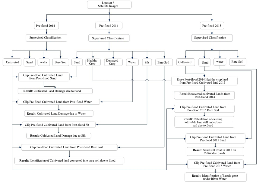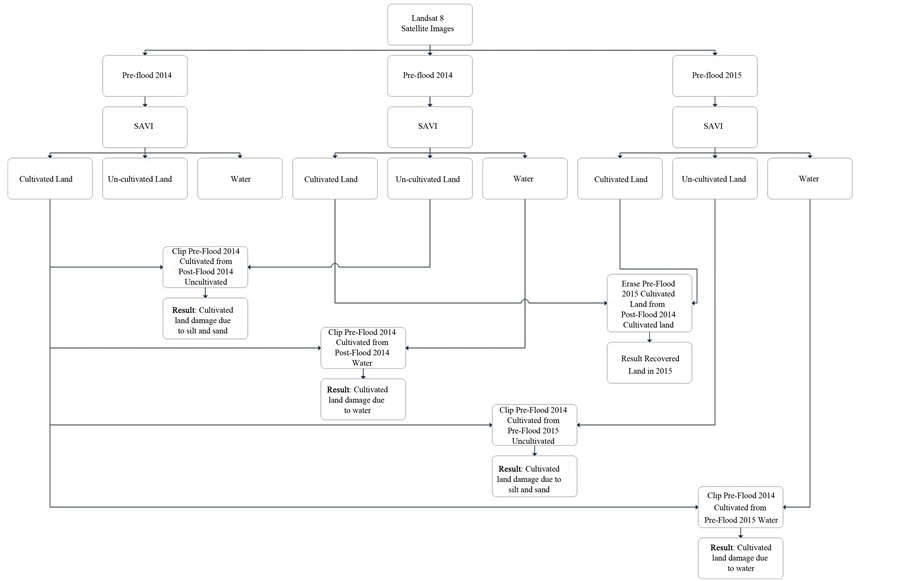 Land damages due to the effects of flood 2014 in Chenab River have been identified and measured through using SAVI and Supervised Classification Methods. Complete methodological frame work is shown in Figure 2 and Figure 3.