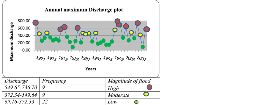 The magnitude of an extreme event is inversely related to its frequency of occurrence, very severe events occurring less frequently than more moderate events [10] . For this study, further insight into flood frequency is provided by the return period analysis. The return period was obtained using the most efficient formula for compu-