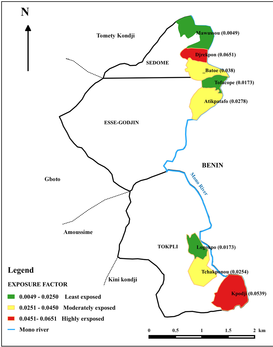 The exposure factor considers the indicators which explain how social entities such as households or economic activities like agriculture, etc., are exposed to flood events. Five (05) indicators are used to explain the determinant of communities’ vulnerability to flood disaster under exposure factor. The composite vulnerability index of this factor is calculated for each village. By considering the composite index of exposure factor, the most exposed villages are Djrekpon and Kpodji with high indices ranging from 0.0451 to 0.0651 (Figure 4). The most exposed villages have the highest scores for most of the considered indicators under the elements at risk compared to the other villages: high population and farmland in flooded area, high percentage of women and children and elderly in flooded area.
