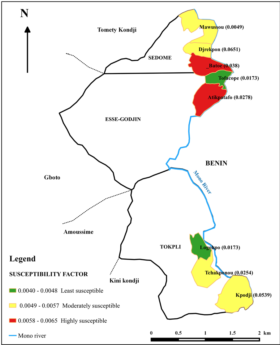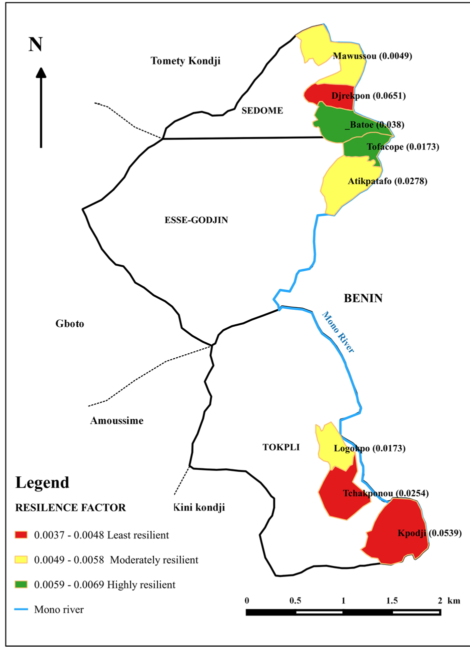 The resilience factor considers indicators which clarify the ability of a Human-Environment system to persist if exposed to flood by recovering during and after the event. Eight (08) indicators have been used to explain the determinants of communities’ vulnerability to flood disasters under resilience factor. The composite index of susceptibility factor for each village is computed. By considering the composite index of resilience factor, the least resilient villages are Djrekpon, Tchakponou and Kpodji with indices ranging from (0.0059 - 0.0069) (Figure 6). The least resilient villages have the lowest scores for most of the considered indicators: Low knowledge on warning system, low evacuation capability, low recovery capacity.