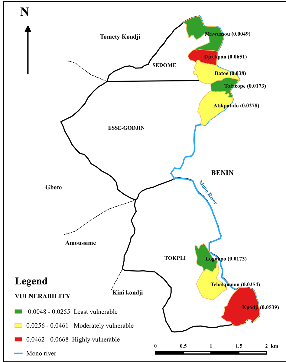 The values of the indicators were used in the vulnerability’s equation (Equation (9)) to determine the overall flood vulnerability index. Among the eight villages surveyed, Djrekpon and Kpodji are found to experience relatively high vulnerability with indices ranging from (0.0048 - 0.0225), Batoe, Atikpatafo, Logokpo and Tchakponou are found to be moderately vulnerable with indices ranging from (0.0256 - 0.461) and Mawussou and Tofacope are estimated to suffer relatively low level of vulnerability to flood disaster with indices ranging from (0.462 - 0.668) (Figure 7).
