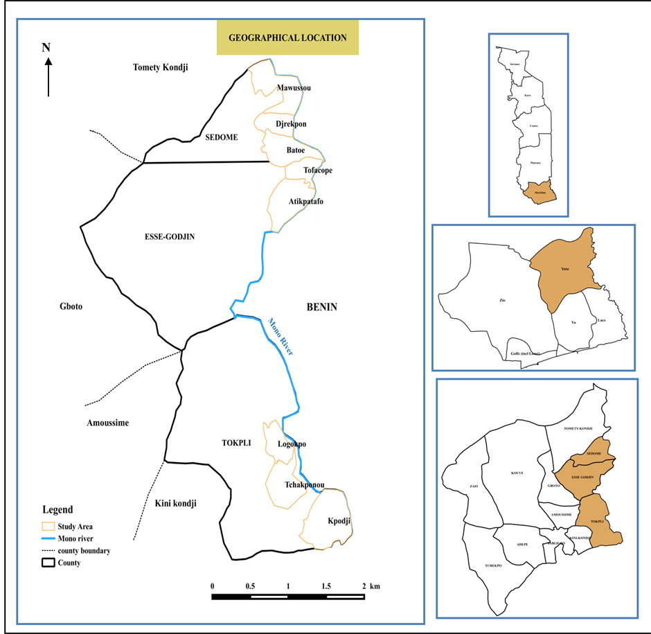 The study was conducted in Yoto district located in North-East of the Maritime region. The district is geographically bound by latitude 6˚30'N and 6˚60'N, longitude 1˚20'E and 1˚35'E. The Mono River system is the largest river system in Togo with catchments area of 21,500 km2; it serves as eastern boundary between the Yoto district and the Republic of Benin. Eight villages from three counties have been selected Sedome (Mawussou, Djrekpon, Batoe), Esse-Godjin (Tofakope, Atikpatafo), and Tokpli (Kpodji, Tchakponou-kondji and Logokpo) for the present study (Figure 1). They are located in the catchment area of the Mono River, where populations have been affected, especially during 2010 flood event, providing then a better study population which can help us to generate a better view on the assessment conducted.
