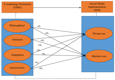 According to [13] , the likely benefits of social media make social media implementation successfully vital for effective marketing strategy. Electronic marketing orientation was developed to tackle electronic marketing and thus suitable for the implementation of social media ( [39] [40] ). Organisations with high degrees of e-marketing orientation are likely to show high social media implementation [41] .