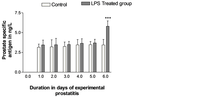 Figure 1 shows the PSA level of test rat with or without exposure of the prostate to LPS and development of experimental prostatitis compared to the control group. There was a gradual increase in serum PSA when compared to the control; resulting in increase in level of PSA which was statistically significant at 95% confidence interval (P < 0.0001); suggesting that infection of the prostate epithelium and exposure to the highly inflammatory molecule, LPS may mediate state of local epithelial inflammatory which interfere with the epithelial cell physiology and result in increased PSA secretion in rat.