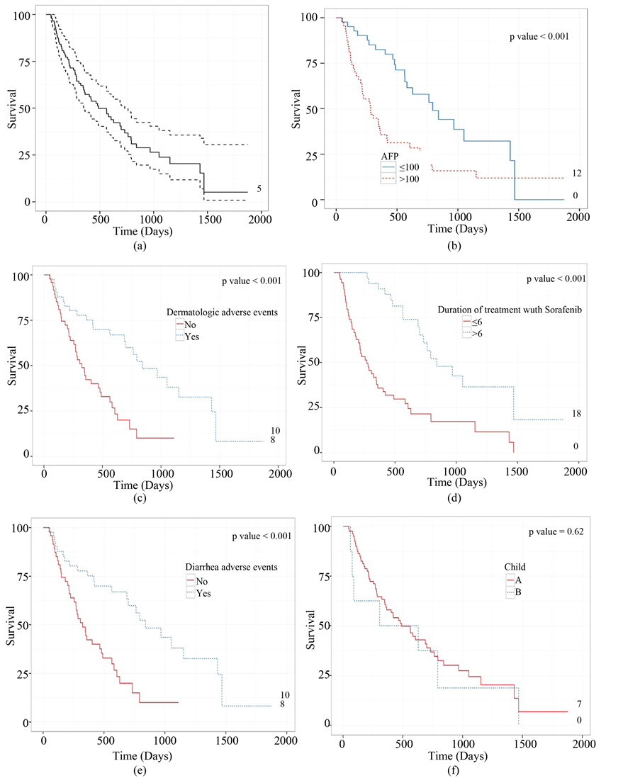 Figure 1. Predictors of OS in sorafenib-treated advanced HCC patients. (a) Overall survival. (b) Patients with AFP level <100 showed better OS. (c) Patients with dermatologic adverse events showed better OS. (d) Patients that used Sorafenib >6 months showed better OS. (e) Patients with diarrhea adverse events showed better OS (univariate analysis). (f) There weren’t difference in OS in relation child pugh class.