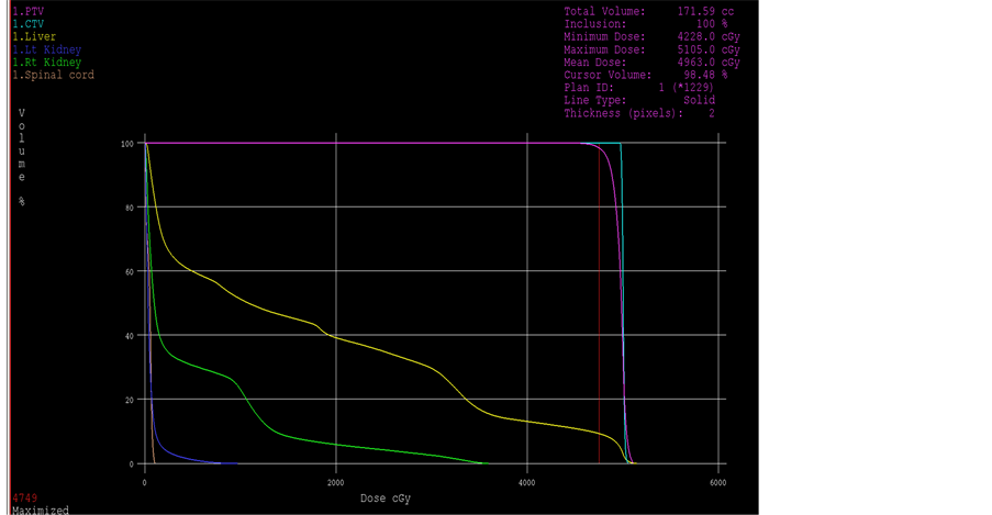 The following constraints were used for the 3D-CRT plan acceptance: 1) PTV covered by at least 95% of the prescribed dose; 2) Maximum accepted dose for hot spots within the PTV was 107% of the prescribed dose; 3) Liver volume receiving dose more than 30 Gy (V30) not exceeding 30%; 4) Spinal cord maximum point dose not exceeding 45 Gy; (5) The total dose received by 30% of both Kidneys not exceeding 20 Gy (V20) (Figure 1).