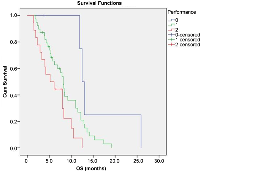 All the patients were followed up for at least 1 year or till death. The median follow up time was 7.4 months (Table 3). The median overall survival (OS) of all the patients in the study was 8.2 months. The 1-year and 2-year OS were 25.2% and 1.9% respectively (Figure 2). The PVTT response was the most significant prognostic factor by both univariate and multivariate analyses in terms of OS. Responders had significant better survival compared to non-responders with a median survival of 12.5 and 8 months respectively (P < 0.0001) (Figure 3). The performance status was statistically significant for survival by both univariate (P = 0.006) and multivariate (P = 0.03) analyses. The median survival for the patients with performance status 0, 1 and 2 was 12.5, 8.2 and 5.2 months respectively (Figure 4).