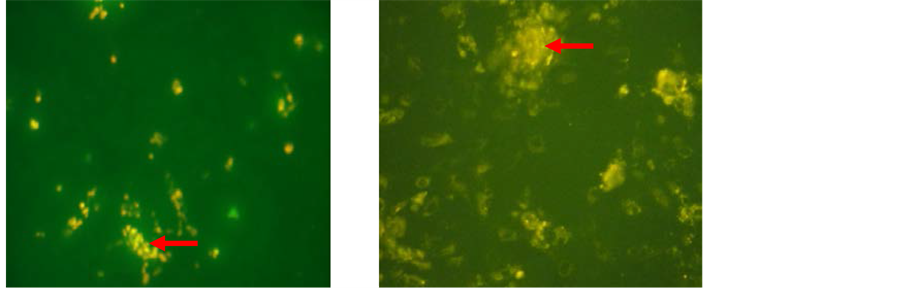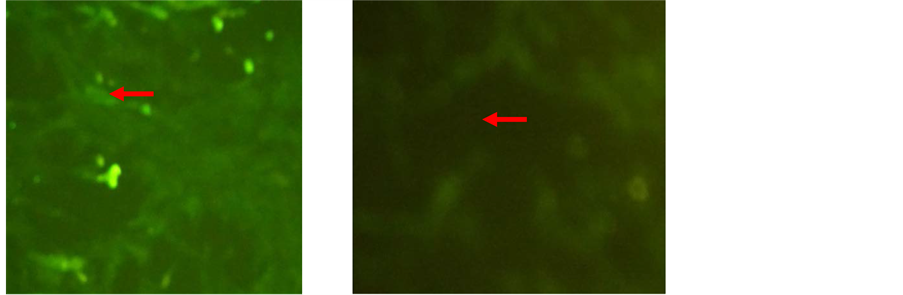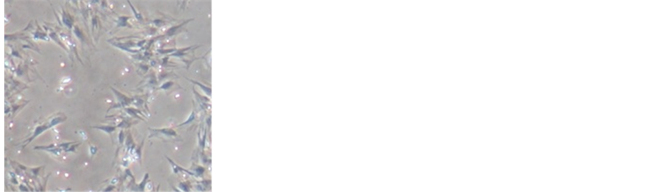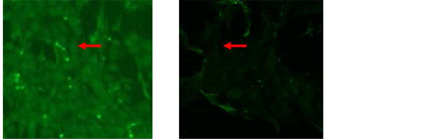 Immunocytochemistry was used to characterize of phenotype rat Bone-Marrow derived Mesenchymal Stem Cell (rBMMSC) specific CD105 positive and CD45 negative. The cultured cells were plated onto coverslips and, after incubated at 37˚C for 1 - 2 hours, fixed with formaldehyde 10% for 15 minutes. The coverslips were then rinsed four times with PBS and let it dry for few minutes. The cells were blocked with for 1 hour in PBS containing 1% bovine serum albumin (Sigma-Aldrich Corp) and 0.1% Triton X-100 (Sigma-Aldrich Corp) for 45 min and then washed with PBS four times. FITC-labelled monoclonal antibody anti-rat CD105 and CD45 was applied to the cells and incubated for 60 minutes. Thereafter, the cells were rinsed with PBS twice and the cells were imaged using an Olympus inverted fluorescent microscope.