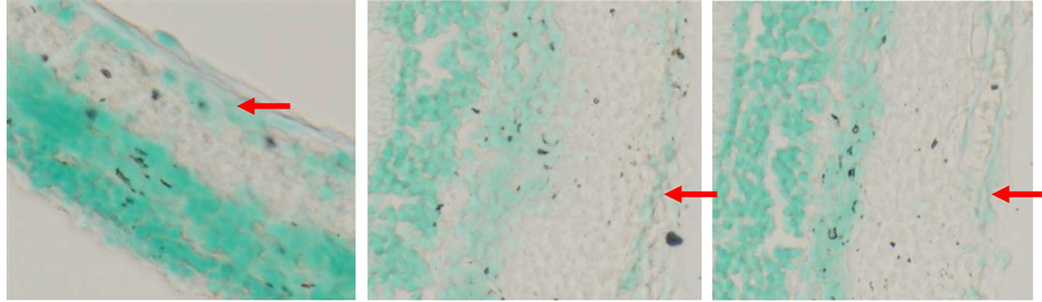 Figure 9. Immunohistochemistry analysis of Brn3b expression four week after transplanted from acute glaucoma animal models. (a) Control group five weeks after intra ocular pressure reduction on acute glaucoma animal models. Arrow showed Brn3b expression on retinal ganglion cells layer; (b) N-BM-MSCs group four week after transplanted N-BM-MSCs. Arrow showed Brn3b expression on retinal ganglion cells layer; (c) HP-BM-MSCs group four week after transplanted PH-BM-MSCs. Arrow showed Brn3b expression on retinal ganglion cells layer (inverted microscope, 400× magnification).