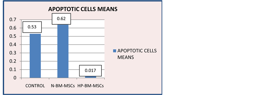 Figure 8. Diagram of TUNEL Analysis on control group, N-BM-MSCs group and HP-BM-MSCs group. Apoptotic cells means on control group 0.533 ± 0.137; N-BM-MSCs group 0.623 ± 0.278; HP-BM-MSCs group 0.017 ± 0.041.