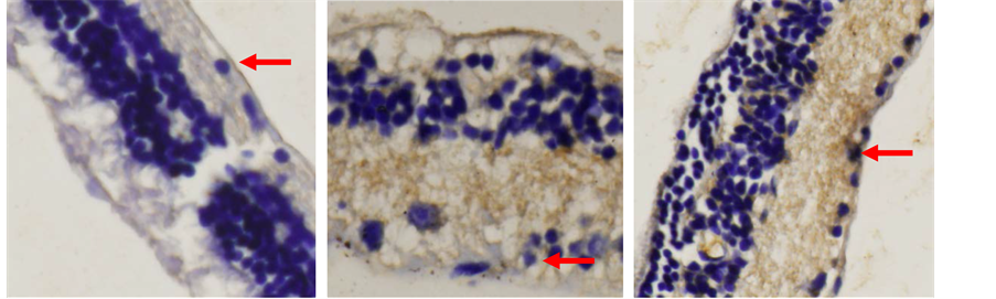Figure 7. TUNEL Analysis on RGCs layer. (a) Control group; (b) N-BM-MSCs group; (c) HP-BM-MSCs group. Arrow showed apoptotic cells in retinal ganglion cells layer (inverted microscope, 200× magnification).